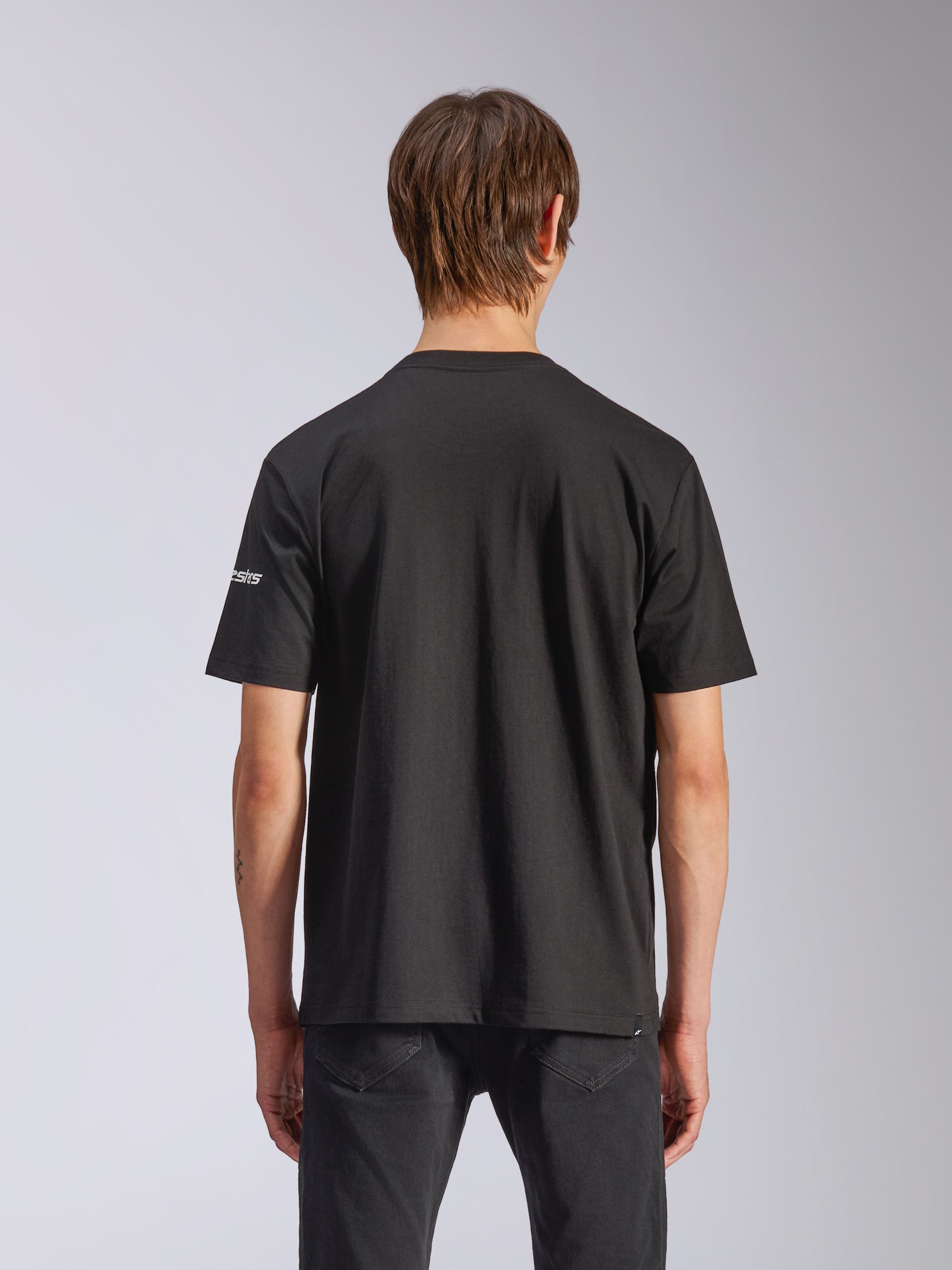 ? Short sleeve sustainable performance wicking tee? Crew neck body with stretch seam construction? Recycled poly and cotton jersey dri-release performance fabric? Front small logo and back vertical astars word print? Internal transfer main label and external label branding? 85% Recycled Polyester. 15% Cotton