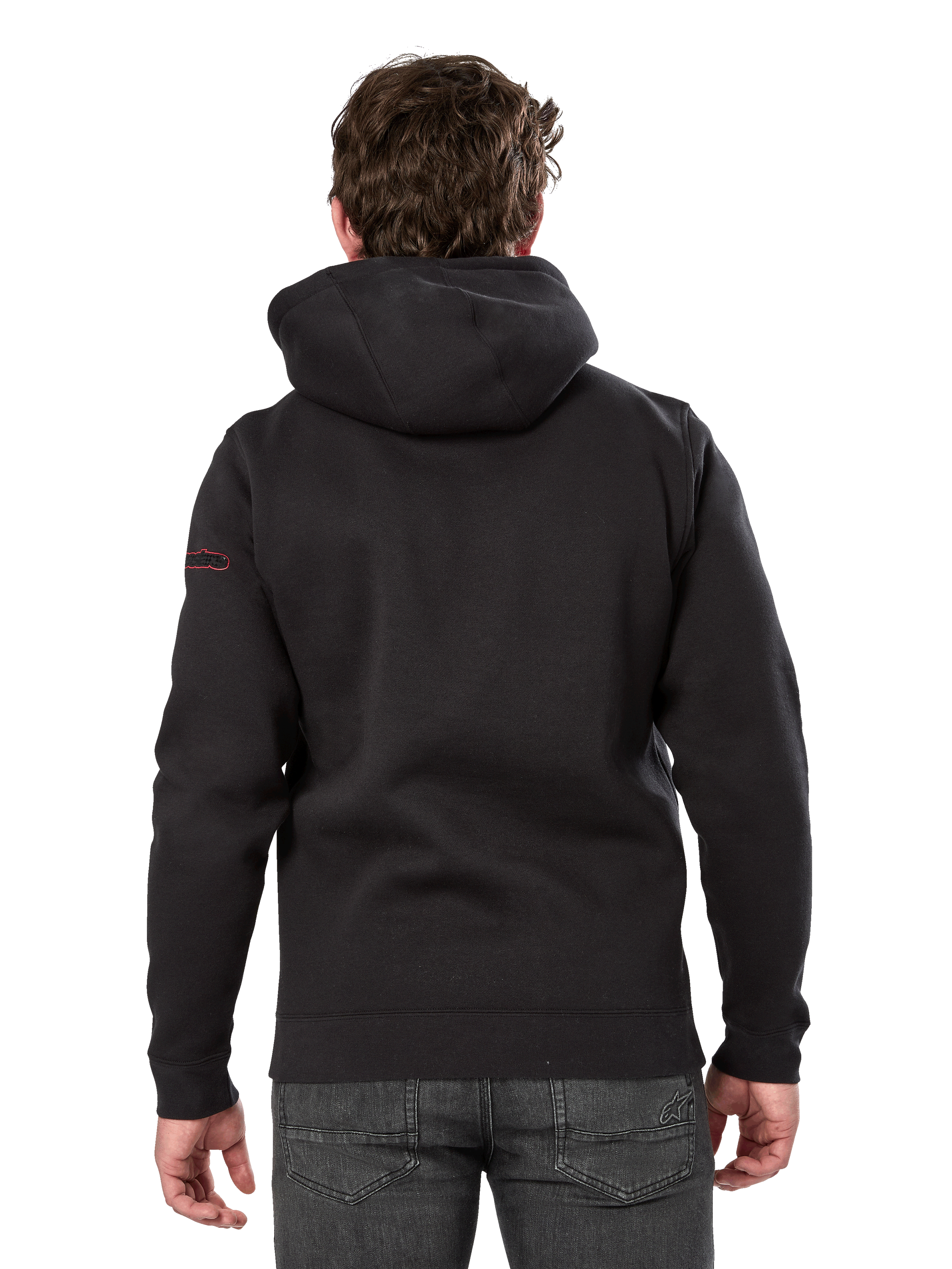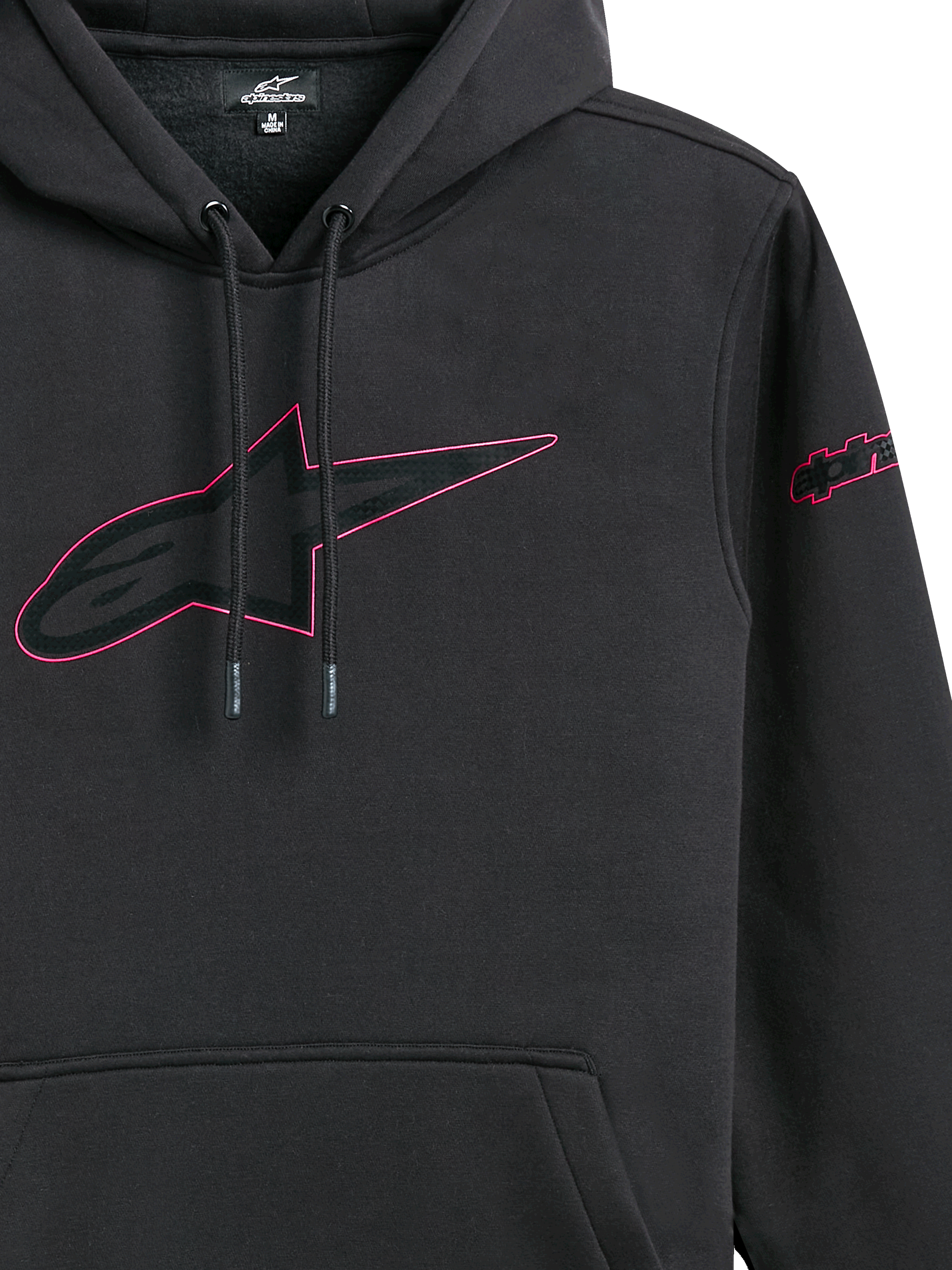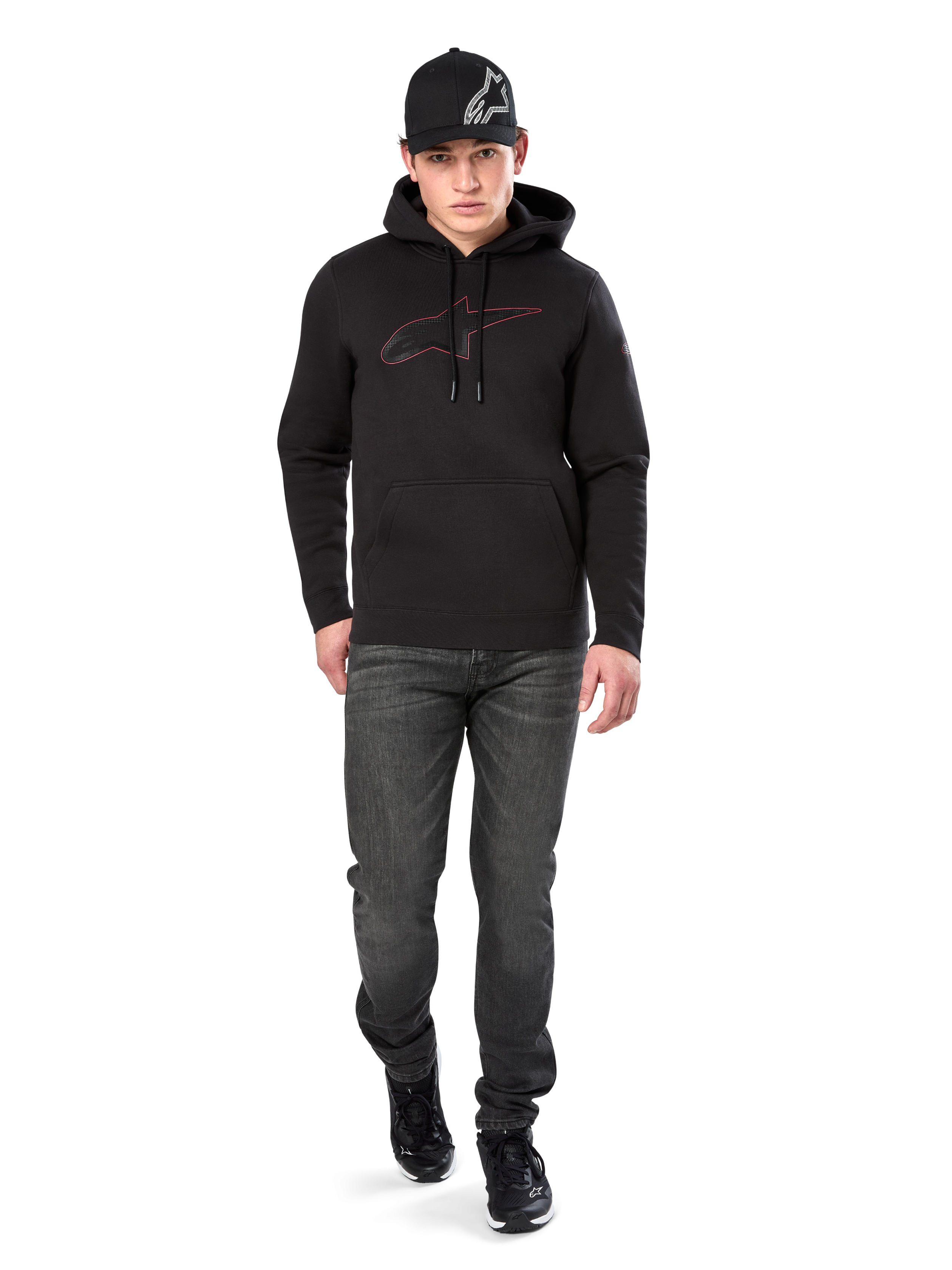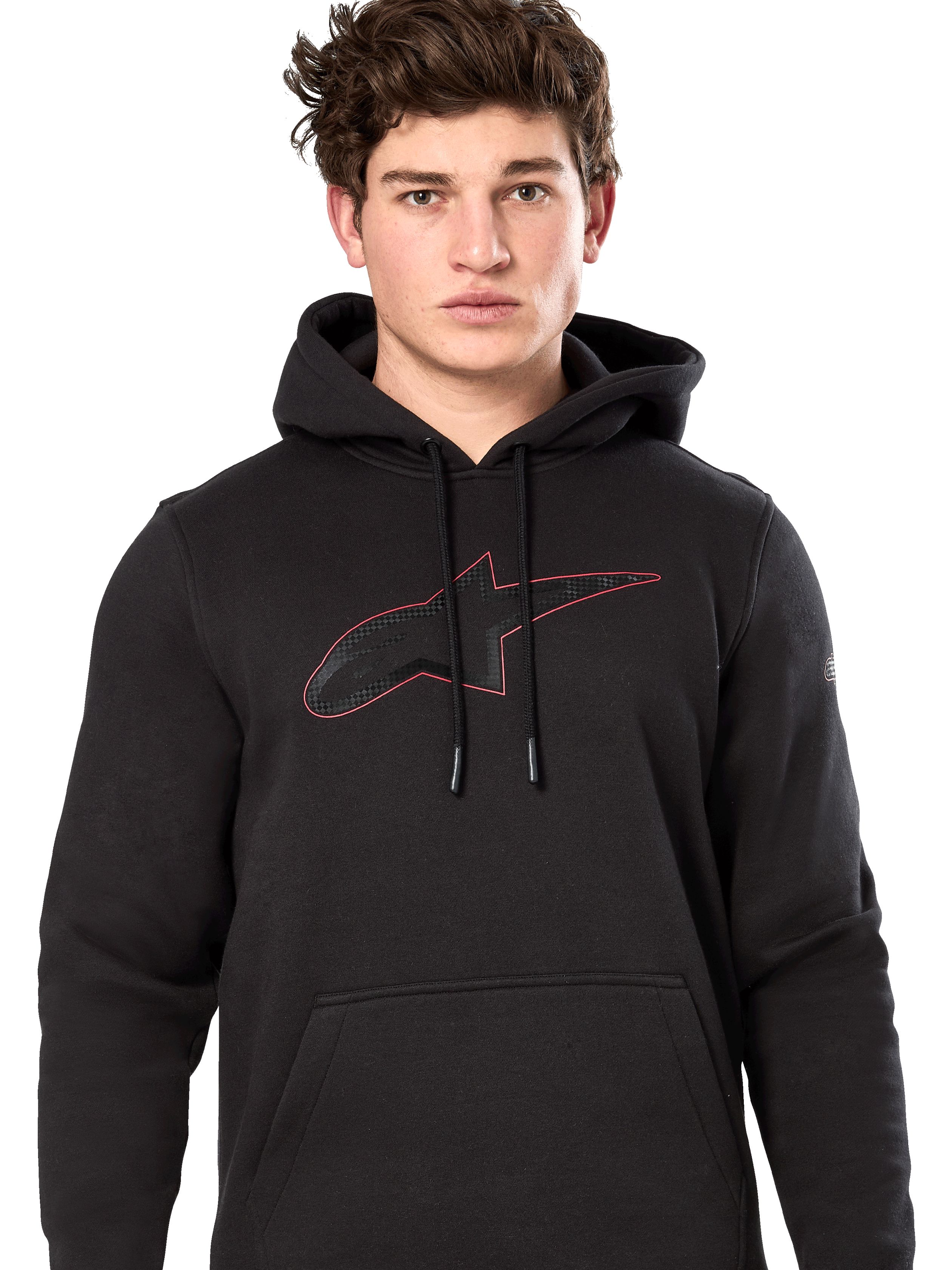 ? Pull over fleece hoodie? Pullover hoodie with kangaroo pocket? Front and sleeve carbon fiber look fill logos with hd print red outline? Self lined hood. dipped drawcord tips. rib cuffs and hem? Internal main label and external label branding.