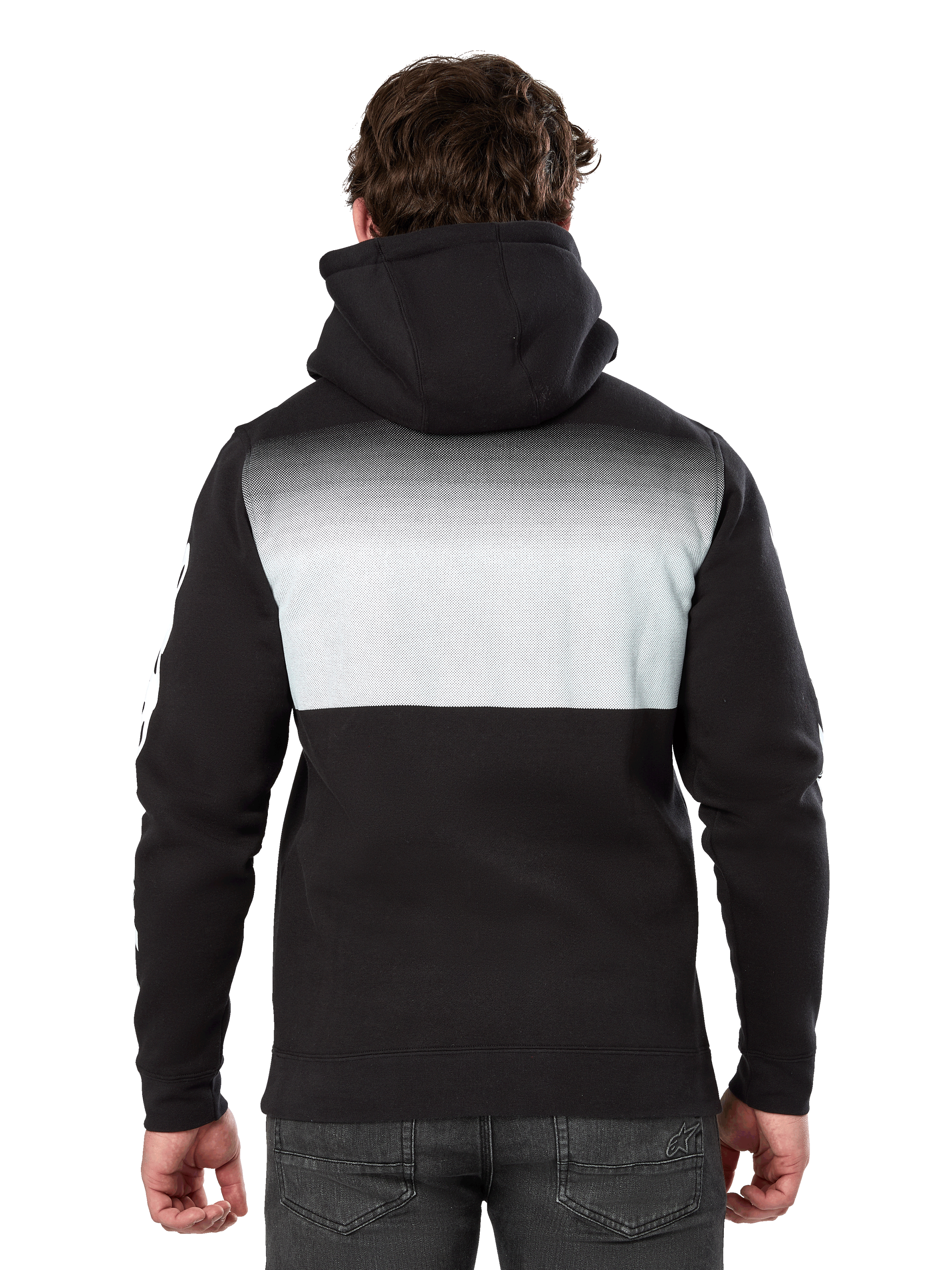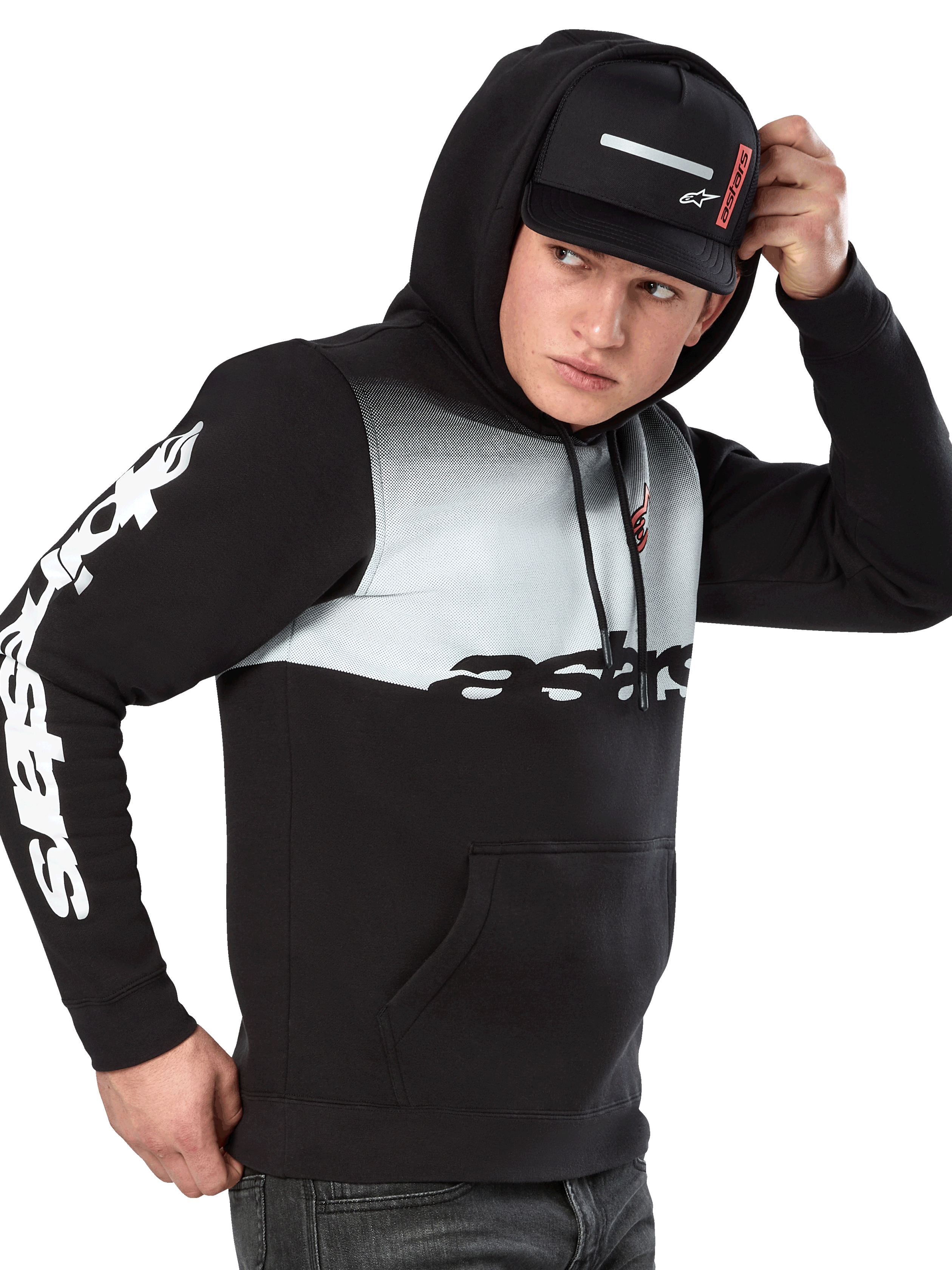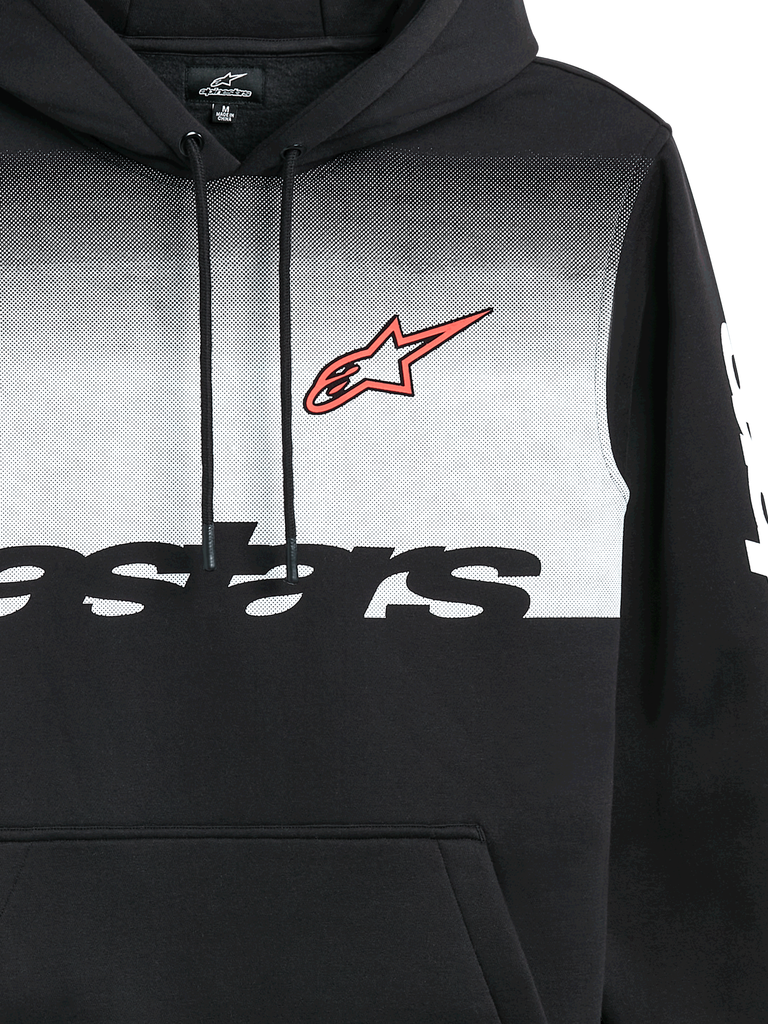 ? Pull over fleece hoodie? Pullover hoodie with kangaroo pocket? Gradation fade print with front hd logo with wordmark logos on sleeves? Self lined hood. dipped drawcord tips. rib cuffs and hem? Internal main label and external label branding.