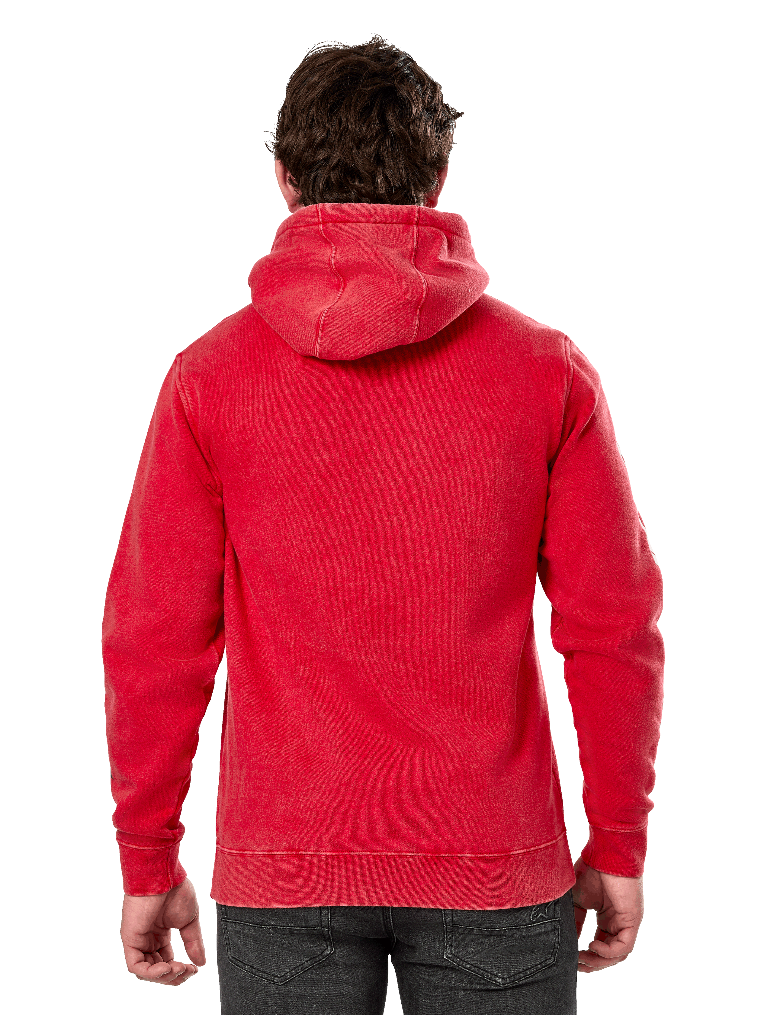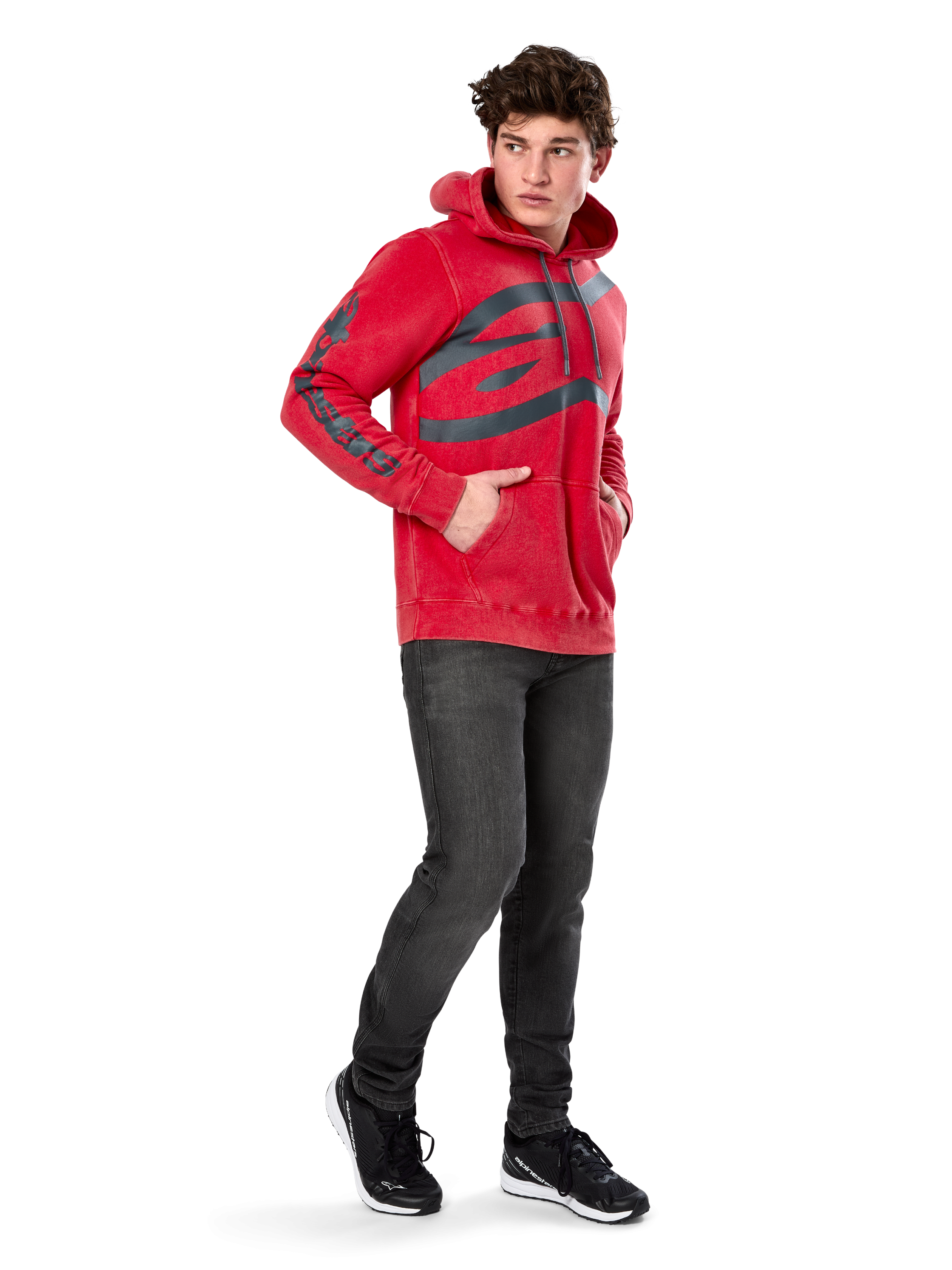 ? Garment dye pull over fleece hoodie? Pullover hoodie with kangaroo pocket? Front extra large logo and alpinestars words on sleeves? Self lined hood. dipped drawcord tips. rib cuffs and hem? Internal main label and external label branding.